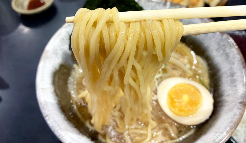 柔らかめな太麺は他のラーメンと変わらずですが、油の多いスープなのもあってか、いつもよりちゅるっと啜れます。
