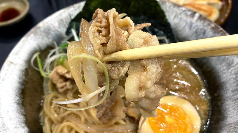 甘い玉ねぎ・スッキリな細ネギ、両方のシャキシャキ食感が麺にもよく絡んで、スープの旨味とも相性抜群です。