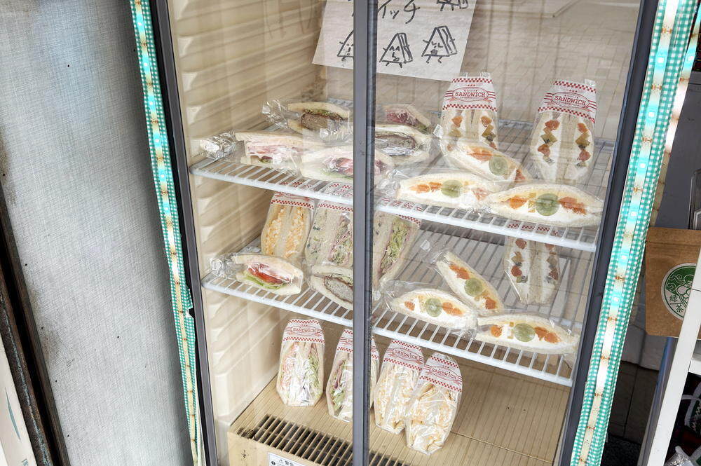 奥は倉庫になっている建物の入口部分で、冷蔵ケース一つと簡易的なテーブルで営業されています。サンドイッチのキャラクターやピンク色のぼりが目印です。