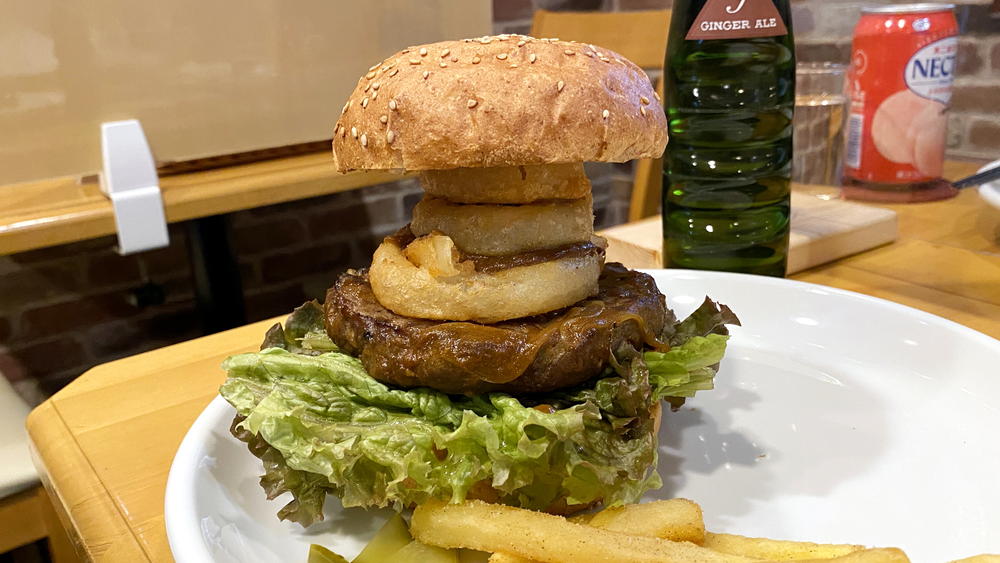 葵区七間町に2019年にオープンしたアメリカンダイナー。お酒と、ハンバーガー・肉料理・カレーを中心に提供しており、写真はいいとこ取りなカレーバーガーです。