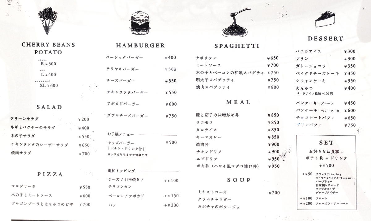 名物のチェリビポテトを筆頭に、ハンバーガー・スパゲティ・ご飯ものと揃っています。ピザやサラダと洋食店のラインナップですね。デザートも豊富。