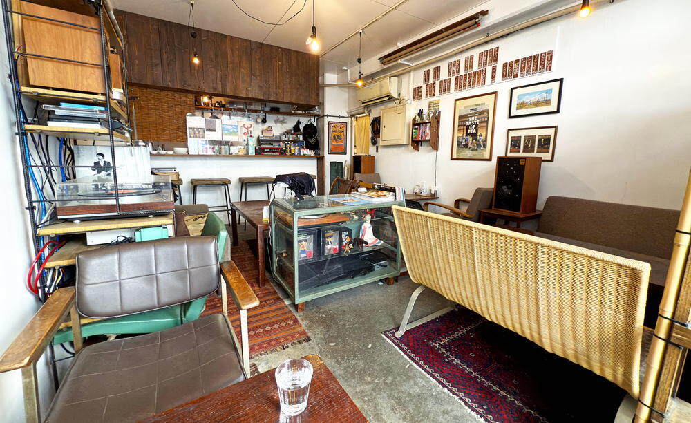 アメリカンレトロな雑貨やポスター・音楽機器が並ぶ店内。席も統一せず並び、秘密基地的な雰囲気。カウンター3席・2人掛けテーブル2・4人掛け2。