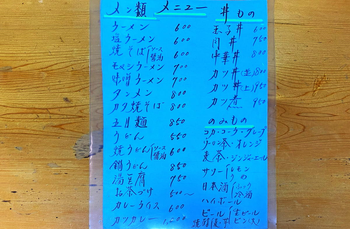 裏面もあり、こちらはラーメン・焼きそば・うどんと揃った豊富な麺類。カレー・丼ものもお手頃価格で揃っています。