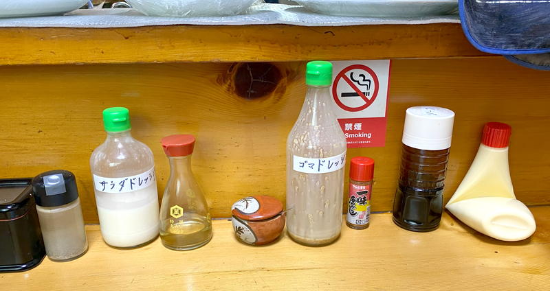 卓上に並んだ様々な調味料・ドレッシングも、レトロな個人食堂ならではの佇まいですが、サラダの味付けの好みに対応できるのはありがたいですね。