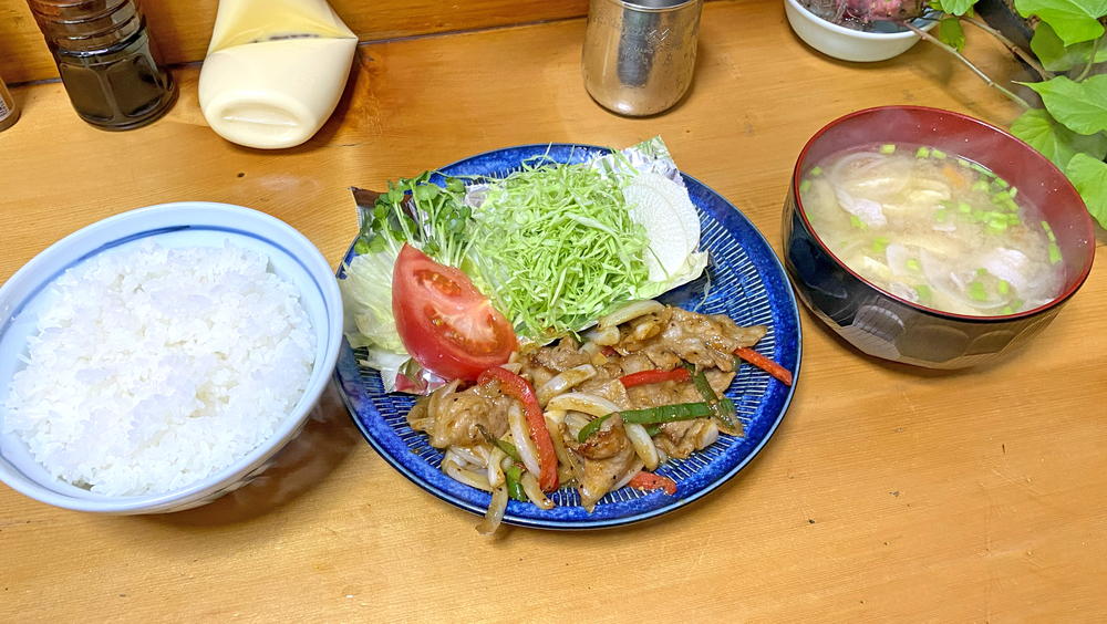 こちらは焼肉定食。メインの皿が小さく見えますが、逆です。こちらも丼みたいなごはんと、セットの豚汁も同じくらいの巨大お椀に入ってデフォでガッツリな模様。