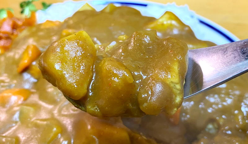しっかり辛くて口に運ぶごとにヒイヒイと熱くなりますが、痛いほどの激辛ではなく、玉ねぎやジャガイモの自然な甘さで程よくまとまっていますね。