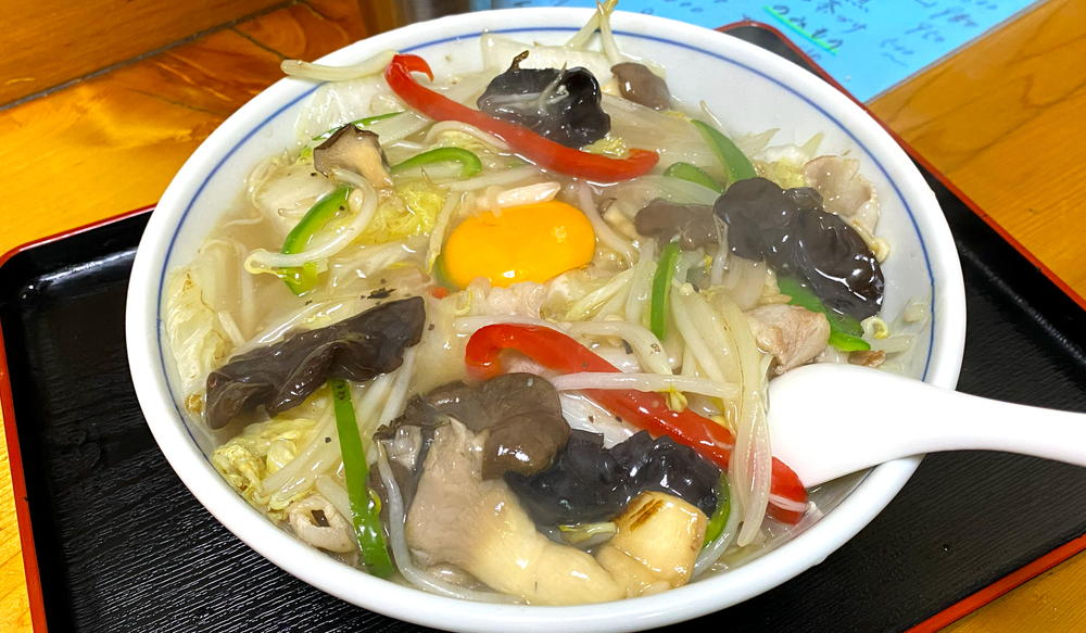 写真だと分かり辛いのですが、こちらも大き目なラーメンの丼のような器で登場。縁までこんもり餡かけ野菜炒めが乗って、隠れているご飯は定食と同じくらいあります。