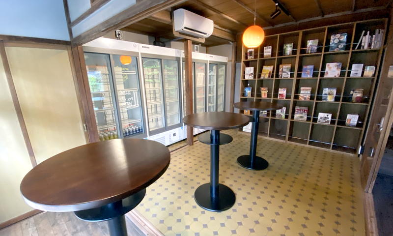 上記の理由で冷蔵庫にはほぼ並んでいませんでしたが、お酒の本が飾られた古民家のリビングそのものな立飲みスペースも併設しています。