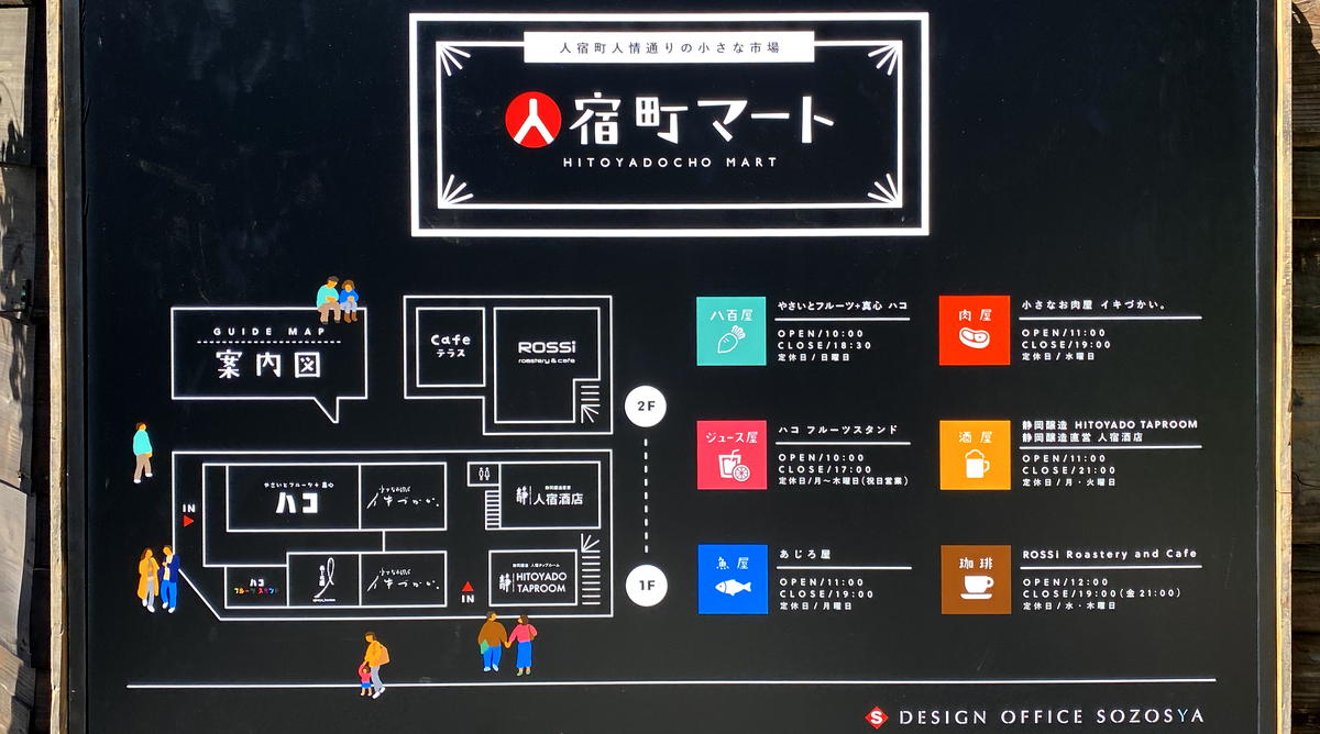 | 営業時間 | ハコ 10:00~18:30 フルーツスタンド 11:00~18:00 あじろ屋 11:00~19:00 イキづかい。 11:00~19:00 静岡醸造 17:00~21:00 土日 11:00~ ROSSi 12:00~19:00 金 21:00まで |