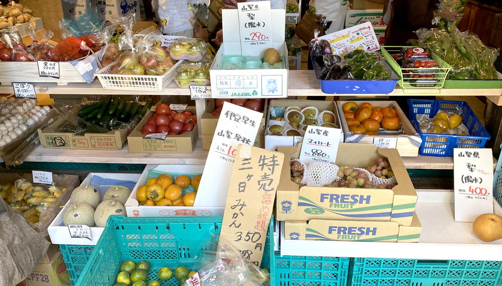 正面入り口側の比較的大きなテナントに入る【野菜とフルーツ+真心 ハコ】さん。様々な旬の野菜・フルーツが並び、みかんの詰放題などもありました。