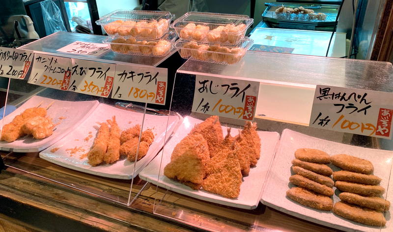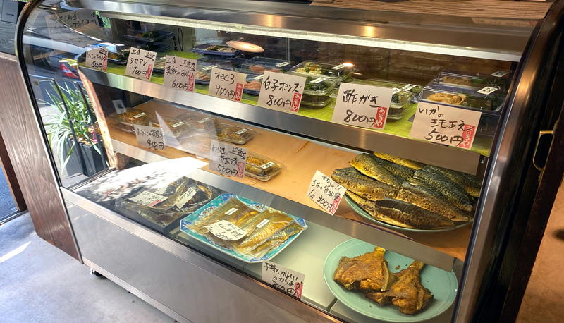 ハコさんのお隣は鷹匠に本店を持つお魚惣菜店【あじろ屋】さん。魚そのものの販売ではなく、寿司や調理した品・フライなど惣菜販売の模様です。