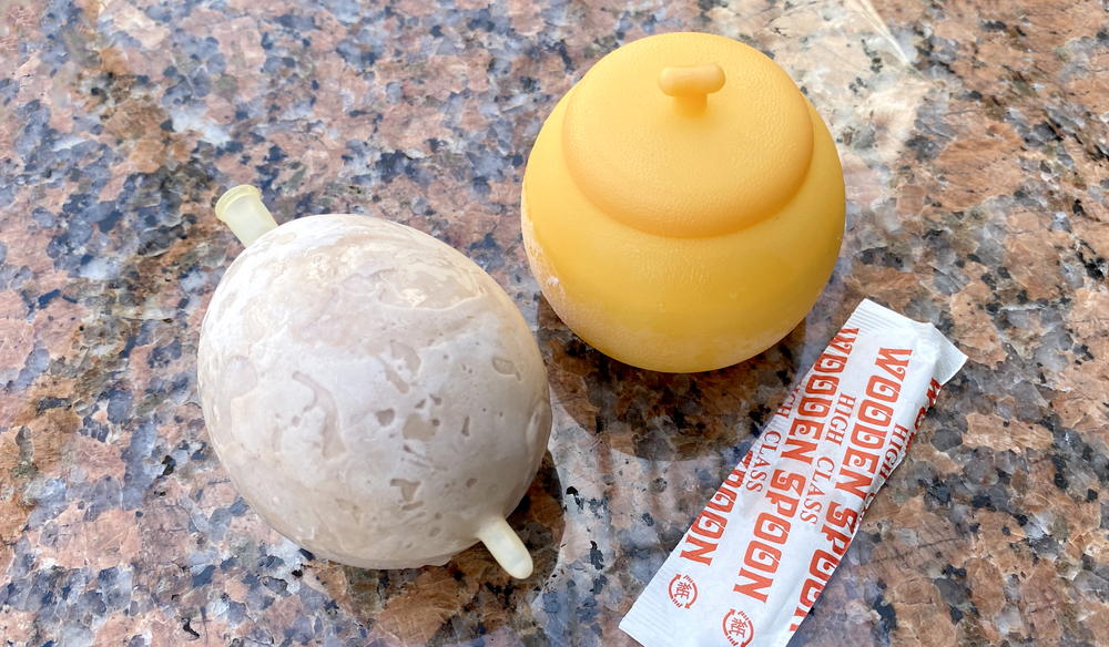 爆弾プリンのように針で刺して皿に盛り付けるものなのかとイメージしてましたが、この先っぽの部分に穴をあけて、溶けだした部分を吸って食べるのが正解なんですね。