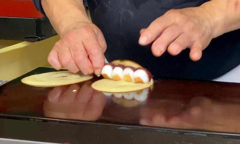 二枚ずつ焼けた生地を重ね、次が焼きあがるまでのタイミングで餡を詰めていきます。隙間を作る為か、重ねる際に一部をくぼませていました。