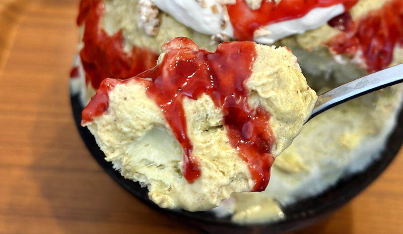 ピスタチオミルクの層と混ぜてより濃厚に、口当たりの変化も楽しめます。甘×甘の組み合わせですが、全部混ぜてもくどい甘さまではいかないのが本当に絶妙。