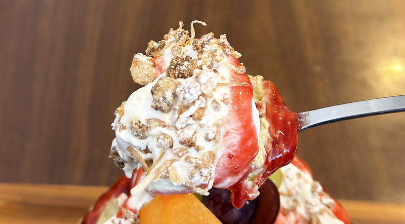 作り立ての練乳ホイップもたっぷり乗って、ナッツとクッキーが混ざったカリカリ、季節で内容が一部変わるフルーツも色々。見た目から豪華でカラフルな1杯です!