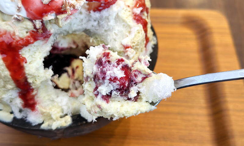 軽い氷としっかり混ざったシャーベットのような口当たりから、風味がぶわっと広がりつつ滑らかに溶けていく一口。ベリーソースも甘酸っぱさ絶妙で後味爽やか!