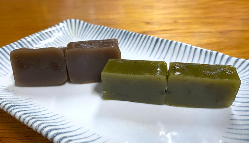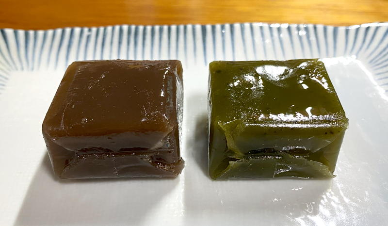 見た目もシンプルながら、綺麗な艶の美味しそうなようかん。お茶の方は茶葉の粒が斑点のように見えています。さくらの見た目はあんこのようかんと間違えそう。