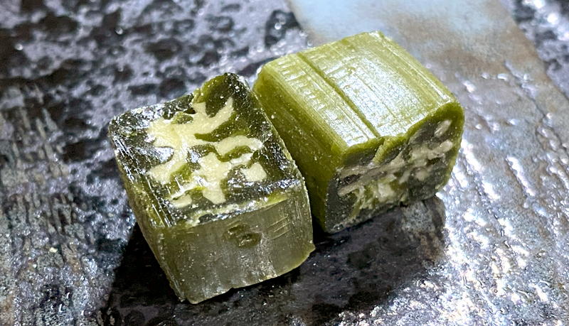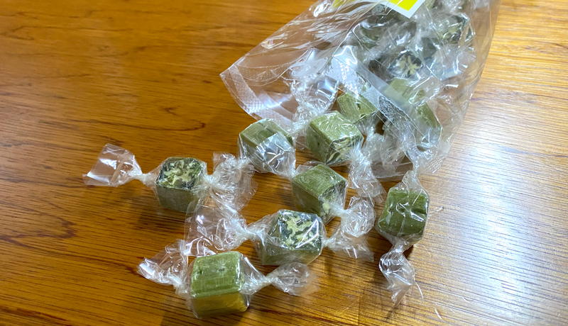 断面に茶の文字が浮かぶ茶飴は、望月茶飴本舗さんが元祖とのこと。断面も側面も綺麗な緑色で、しっかり抹茶のお菓子感がありすね。