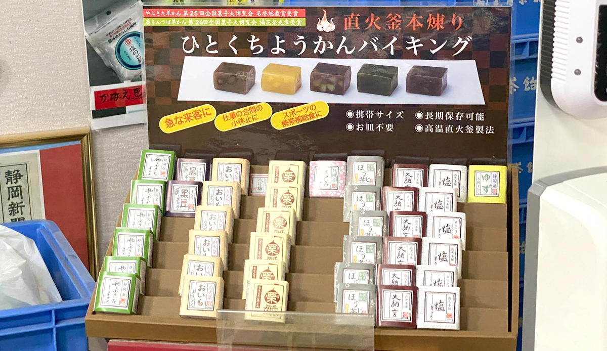 『ひとくちようかんバイキング』の棚に、四角いミニサイズのようかんが並んでおり、どれでも1個140円。これでも一部のみとのことで、公式通販には21種類もありました!