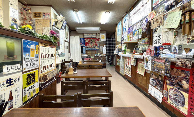 店内は奥に長く、4人掛けテーブルが4つ。左側に小上がり席もありますが、時間帯によるものか、おでんの仕込み用の素材などが並んでおり使えませんでした。