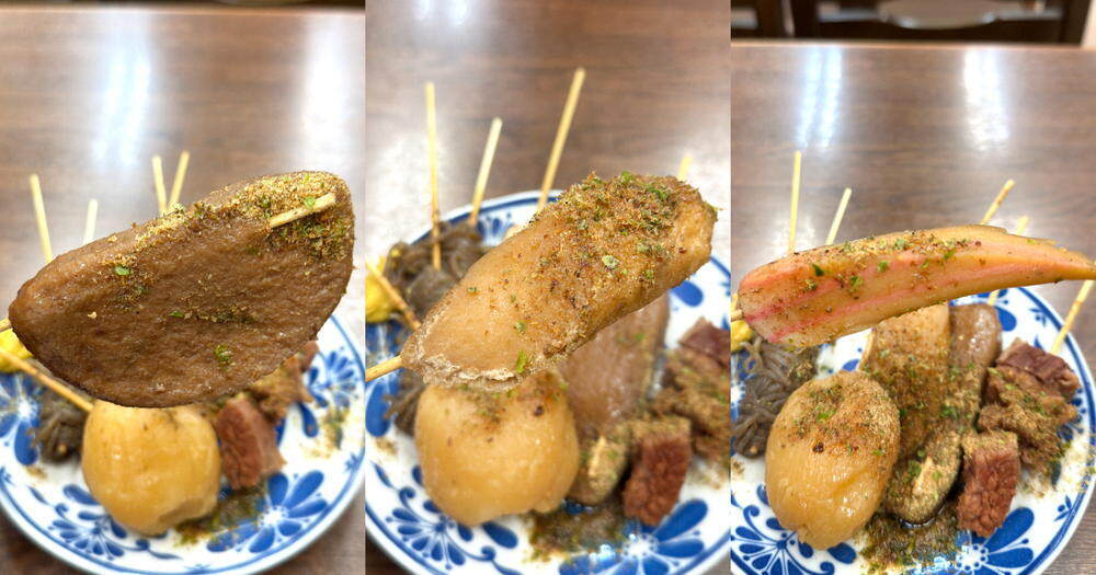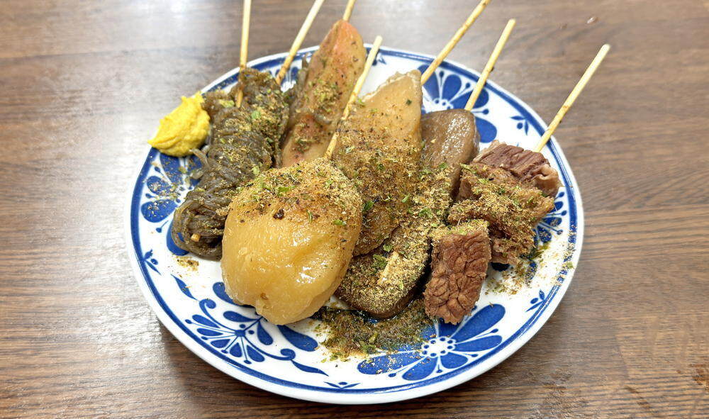 今回はこちらの6本。どの品もよく煮えて濃い色!青のりといわし削り粉を合わせた"だし粉"もたっぷりかけてもらいました。