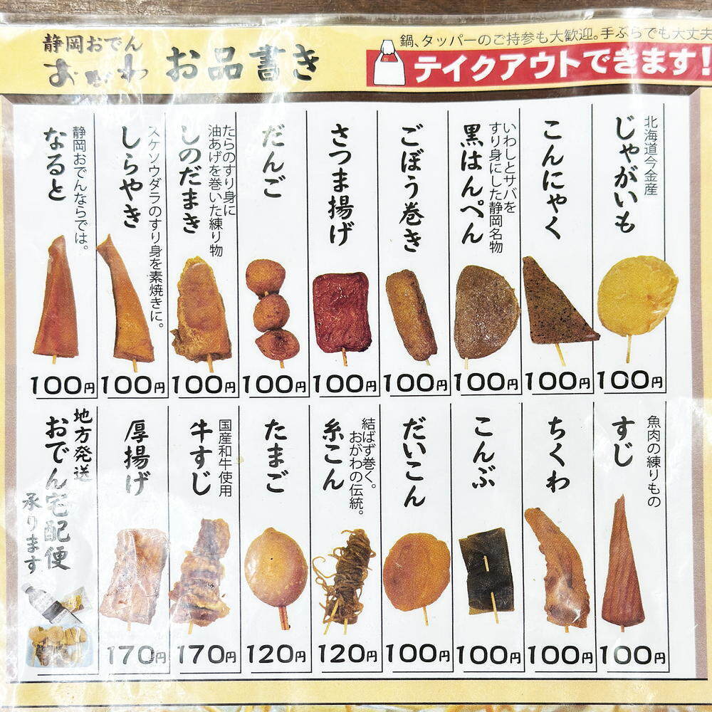 17種のおでん種。殆ど100円で、糸こん&たまごが120円。牛すじ&厚揚げが170円となっています。お会計は後で、本数&串の形で計算。