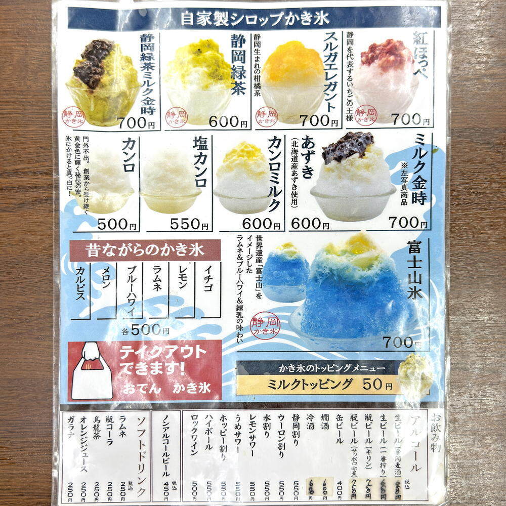 自家製シロップのかき氷メニューも年中提供。静岡らしいフレーバーが揃い、昔ながらの定番フレーバーも。ドリンクはお酒も充実しています。