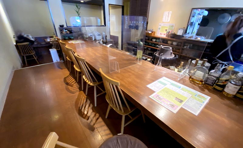 カウンター6席に、奥は2人掛けテーブルが5つ。こちらは動かせるテーブルなので、グループによって4~6人掛け用にもできます。総席数は少ないので予約推奨ですね。