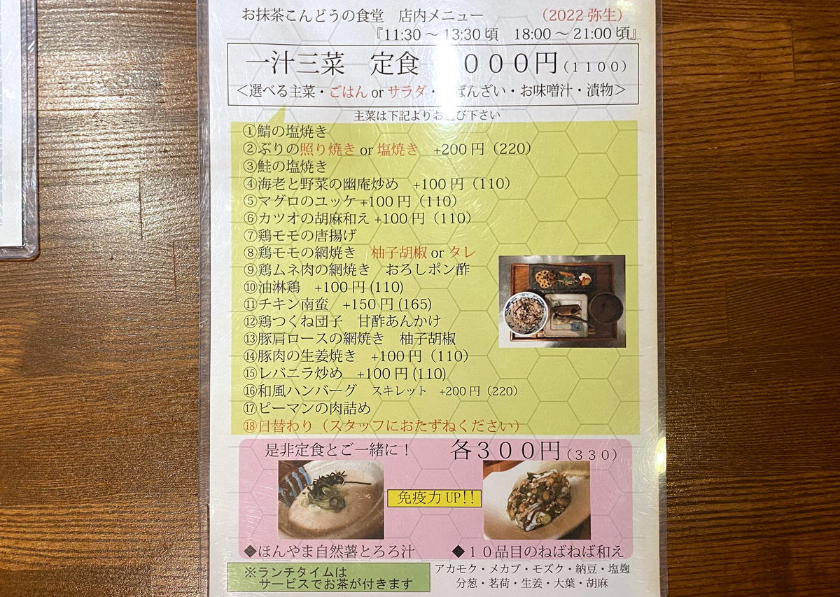 お抹茶こんどうさんのメインは『一汁三菜定食』こちらは昼も夜も提供しており、18種類から選べるメインにごはん or サラダ・おばんざい2種・味噌汁・漬物が付きます。