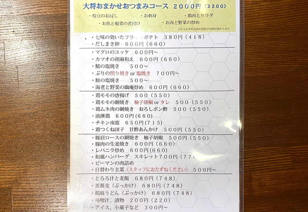 こちらは基本夜からのメニュー。定食のメイン料理中心に、おつまみとして色々揃っている他、お得なおまかせコースもあります。