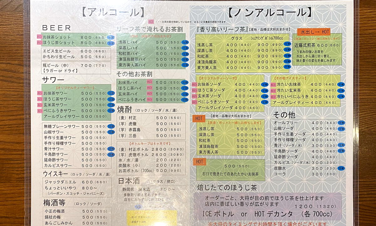 静岡茶中心の日本茶・お茶ソーダなど様々な形で揃ったノンアルコールメニュー。アルコールメニューもお茶ビールやお茶割も豊富な唯一無二のお茶晩酌ラインナップ。