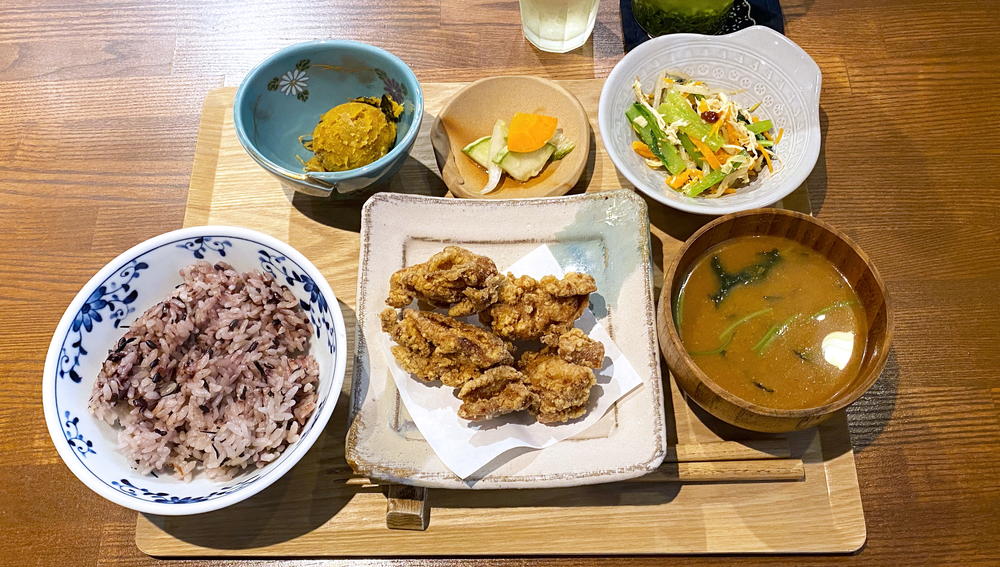 今回はランチで利用。一汁三菜定食をメインは鶏モモの唐揚げで注文。お皿の種類もそれぞれ異なり、見た目からお洒落な和定食になっていますね。
