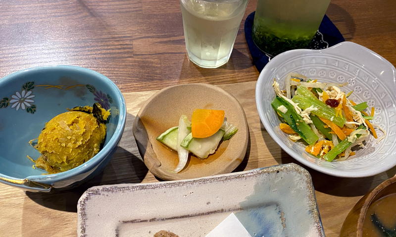 おばんざい2種と、つけものは浅漬けですが塩気がしっかりしておりおかずになる味わい。メインは食べた事無い野菜でしたが小メロンですかね?