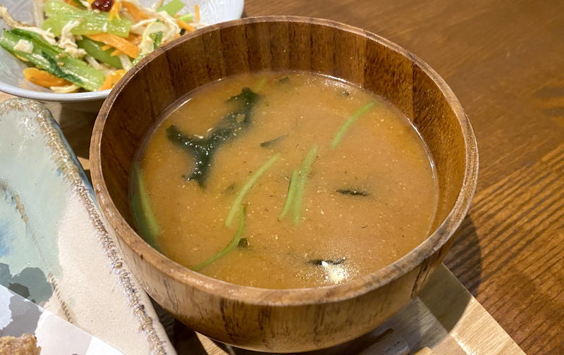 味噌汁はかなり濃い目の味付け。おばあちゃん家で食べたような懐かしさを感じる、おかずになる味わいでした。水菜とわかめのみでとてもシンプルです。