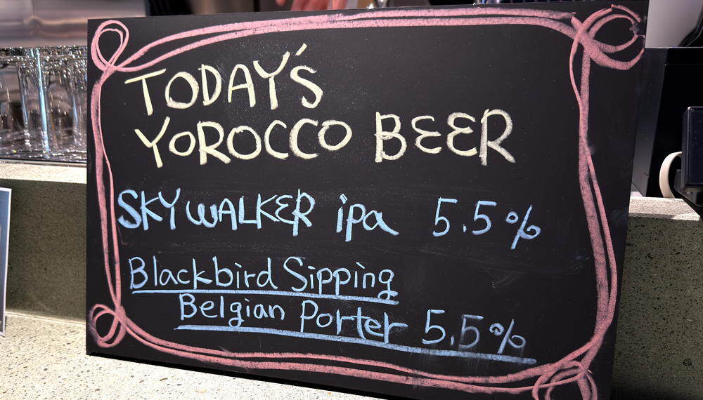 ヨロッコビールはスモールグラス600円・ハーフパイント1200円・パイント1600円の3段階で、カウンターの黒板に書かれた日替り2種から選べます。
