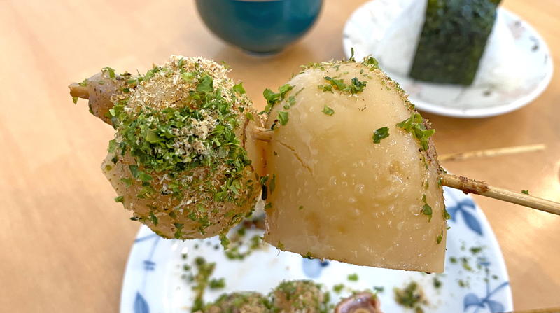 斜めカットな大きいなると串。練り物特有の甘みともちもち食感、芋や肉以上にバッチリ出汁を吸い込んで、静岡おでんと言えばな味わい深さを満喫できました!