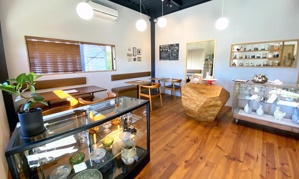 色合いお洒落なカフェのような雰囲気の店内。ガラスケースには陶芸作家さんの作品なども並んでおり、購入できる品もあるそうです。