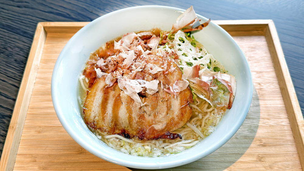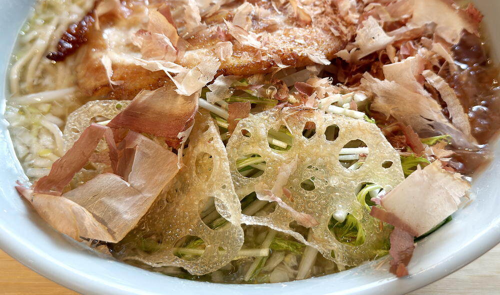 グリルされた大きなチャーシューが目立ち、その上から花鰹節がたっぷり!れんこんチップや、スープの中にも野菜トッピングが色々隠れています。