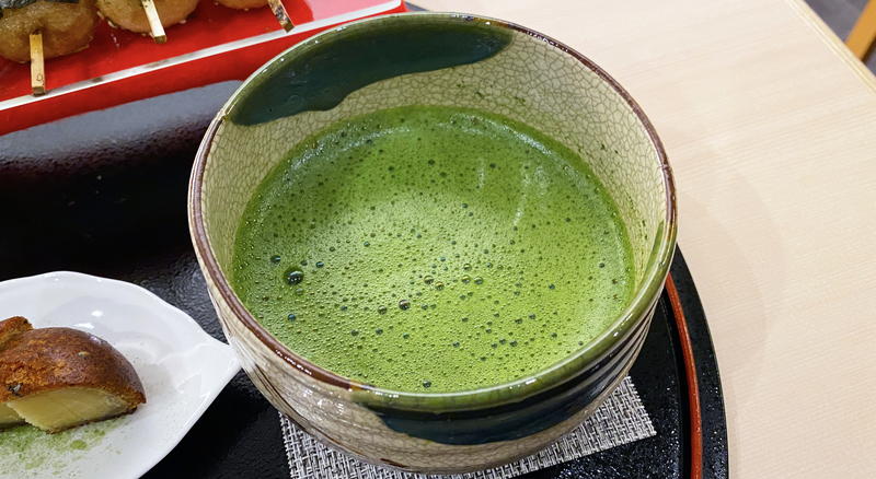 温かい抹茶はしっかりした苦みが奥から来ますが、泡がクリーミーで甘みも感じ、かつ様々なスイーツと組み合わせることで印象の変わる基本の一杯です。緑が美しい。