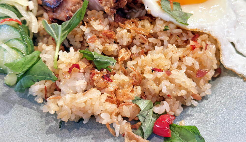 フライドライスは焼き飯のジャンルで、味わいのイメージとしてはほぼ炒飯。バジルはライスと共に炒められたものと上に散らした生で2層に効いて爽やかに香ります。