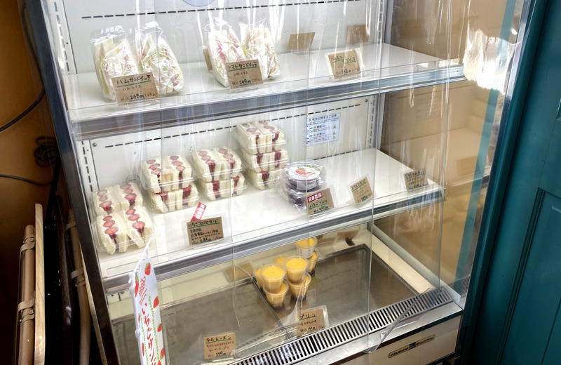 冷蔵ケースにはサンドイッチやフルーツサンド。手作りプリンも並んでいました。棚に並んだ品は基本無くなり次第終了で、同じ品の追加は無しとのことです。