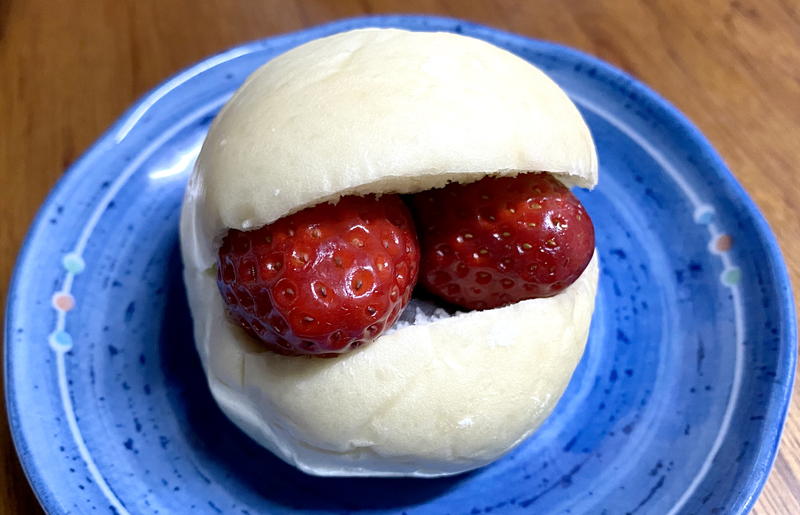 最近見かけた新メニュー?いちごシーズンのみの限定品だとおもいますが、大粒のいちごが2つと、塊のこしあんが入った可愛いあんパンです。